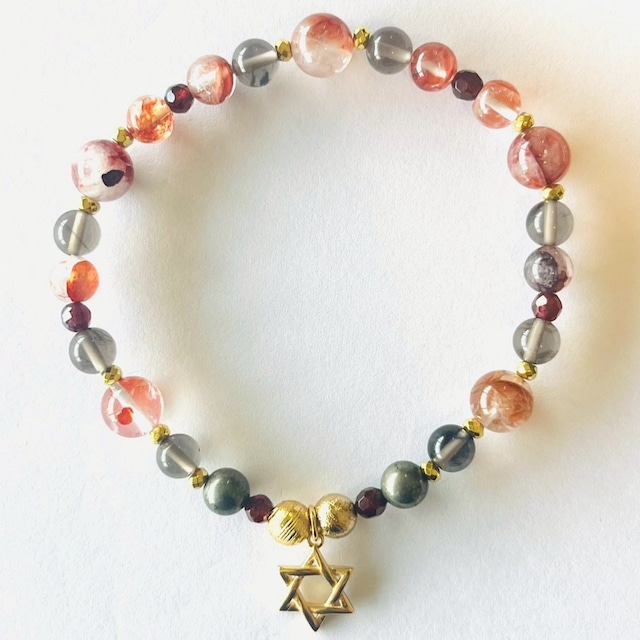── ☽⛧☾ ── ☦︎︎ Passion of the Fire Goddess 〜火女神の情熱〜☦︎︎ 私は創造の炎。 私は覚醒を告げる火柱。 情熱により蘇り、 滅びにより神性へと還る。 女神は我が内に燃え上がり、 私はその炎となり、 やがて彼女そのものとなる。 ── ☽⛧☾ ── ♰Composition♰ Pink Fire Azeztulite(ピンクファイアーアゼツライト) Hematite(ヘマタイト) Agni Manitite(アグニマニタイト) Almandine Garnet(アルマンディンガーネット) Golden Pyrite(ゴールデンパイライト) Gibeon Meteorite(ギベオン隕石) Hexagram Charm (六芒星チャーム) ── ☽⛧☾ ── 内なる火を呼び覚まし、 情熱と神性を融合させるブレスレット。 ピンクファイアアゼツライトが、 霊的創造力とハートの愛を目覚めさせ、 アグニマニタイトと ゴールデンパイライトが、 内なる火を活性化し行動力へと変える。 アルマンディンガーネットと ヘマタイトの組み合わせは、 情熱のエネルギーを地に根付かせ 身体性と精神性の統合を促進。 ピンクファイアーアゼツライト8mmは 5箇所に配置されており、 6mmは6箇所に配置し 11の星=エンデカグラム(秘教的な11芒星)を形成 情熱と霊性が交差する 魔術的フォーメーション。 ギベオン隕石が、 それらの力を宇宙的次元へ接続し、 六芒星チャームが全体をひとつに結び、 創造・破壊・再生の エネルギー循環を完成させる。 霊性・愛・意志・肉体 そのすべてが燃え上がり、 女神としての自己を顕現させるための魔術的結晶。 ── ☽⛧☾ ── ♰ご購入にあたってのご案内♰ ・こちらの商品は限定1点のみのご用意となります。(内径 約 16 cm) ☦︎︎ご購入から発送に関するご注意とお願い https://btr.base.ec/p/00003 ・天然石特有の色味や模様の個体差、またモニター環境による若干の色差がある場合がございます。 ・商品に欠陥がある場合を除き、返品はご遠慮ください。 ── ☽⛧☾ ── 彼女の名を知る者は、 呼吸の深みに炎を宿す。 燃ゆる薔薇のごとく、 情熱はその身を焦がし、 灰の淵より新たな名を産み落とす。 肉体は炉。 血は火種。 意志は風。 魂は光。 これは「創造の炎」。 これは「目覚めの刃」。 そして━━━━━ 君の内に眠る女神は、いま目覚める。 ── ☽⛧☾ ── https://www.instagram.com/beyond__the__reincarnation/p/DWTQfYck826/